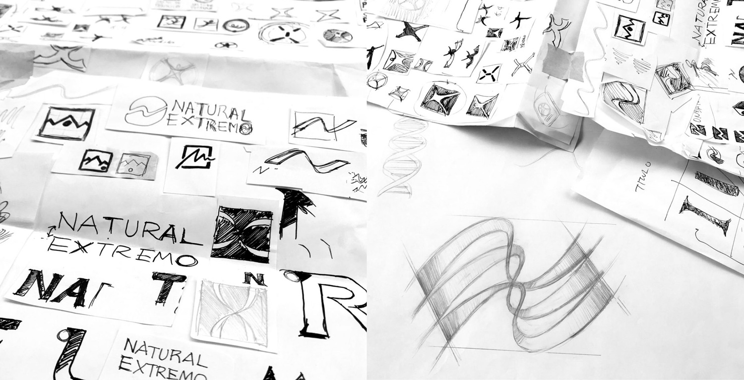 O símbolo antigo da Natural Extremo foi totalmente redesenhado, pois não representava a visão da empresa. A primeira etapa de criação partiu de muitos esboços no papel, buscando os elementos que poderiam contribuir na transição de marca - de algo tangível e evidente para uma identidade mais abstrata, conceitual e viva.